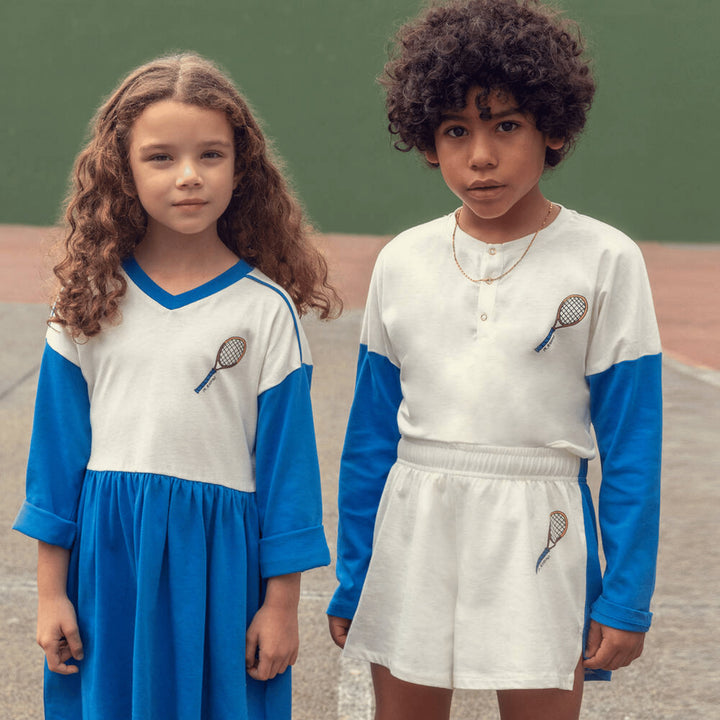 In an off-white and bright blue colourblock, these casual organic cotton shorts for boys and girls are by Mini Rodini. Made in super soft and lightweight jersey, they have a tennis racket motif and a little logo print on the front. The elasticated wa