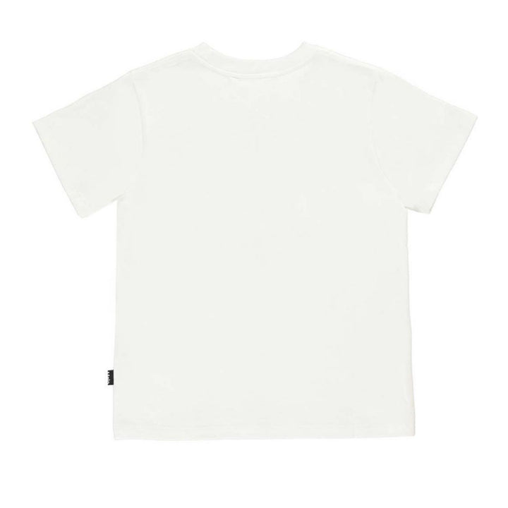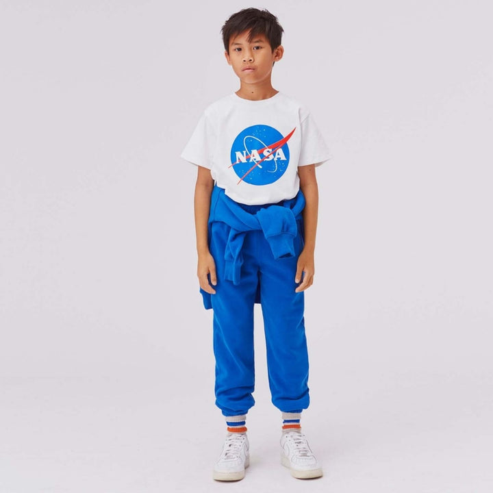For boys and girls, this fun white T-shirt by Molo is made in soft organic cotton jersey. Ideal for fans of space travel, it has a bold blue and red NASA print on the front.