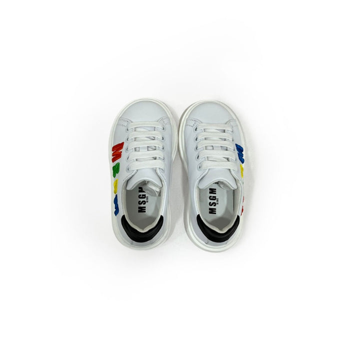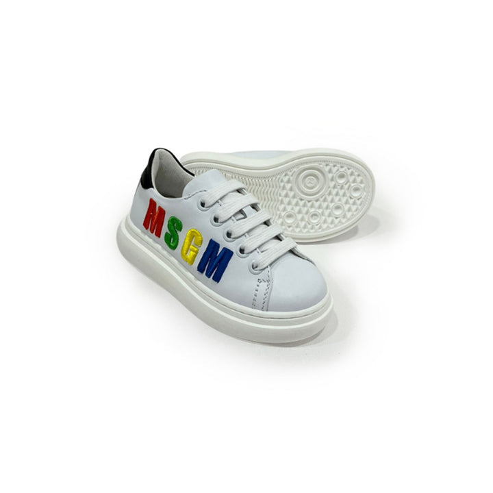 embroidered-logo leather sneakers from MSGM Kids featuring white, multicolour, calf leather, embroidered logo to the side, round toe, front lace-up fastening, contrasting heel counter and flat rubber sole
