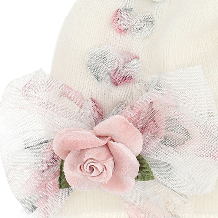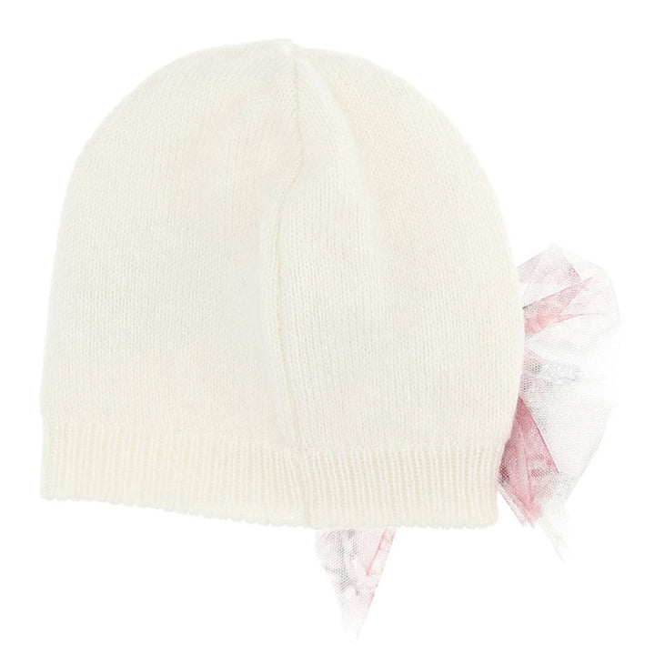 White hat baby girl Monnalisa Kids. Knitted design, bow detail, floral appliqué, logo charm and ribbed hem. Polyester 1%, Virgin Wool 5%, Acrylic 5%