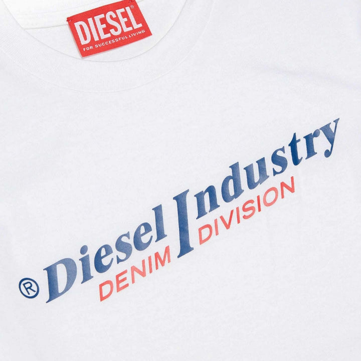 Crew-neck, short-sleeved t-shirt with 'Diesel industry, Denim Division' logo on the front. Made of 1% cotton.\