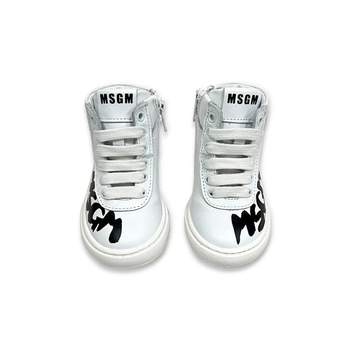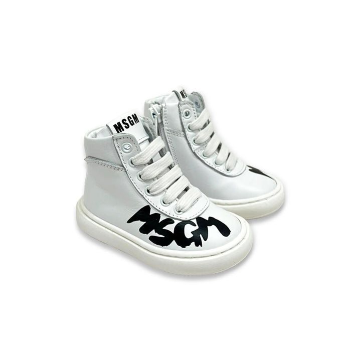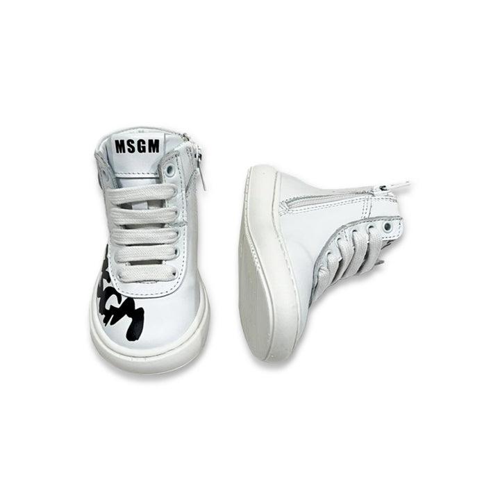 White leather trainers for boys and girls by MSGM. They are lined in soft leather, with a leather inner sole and non-slip rubber outer sole. Fastened with laces, they have a black logo print on the sides and the heel is trimmed in black.