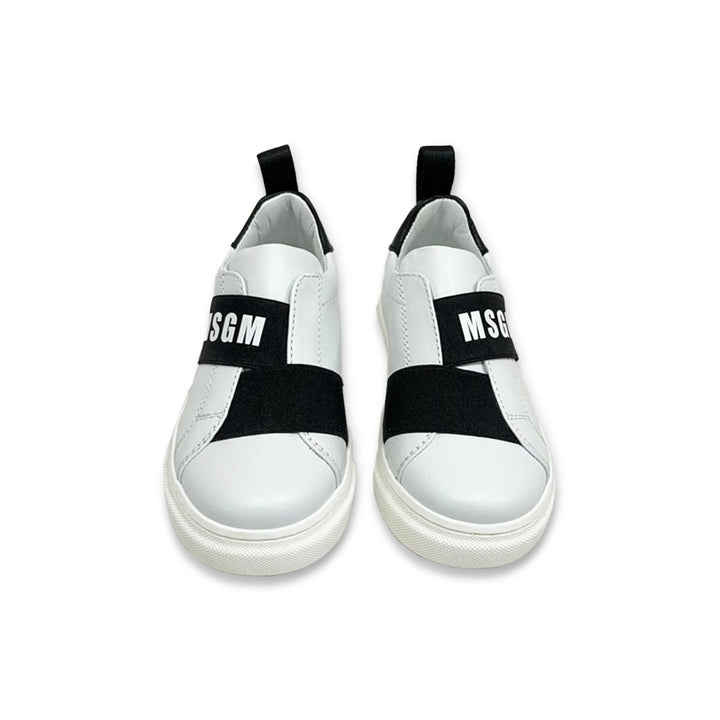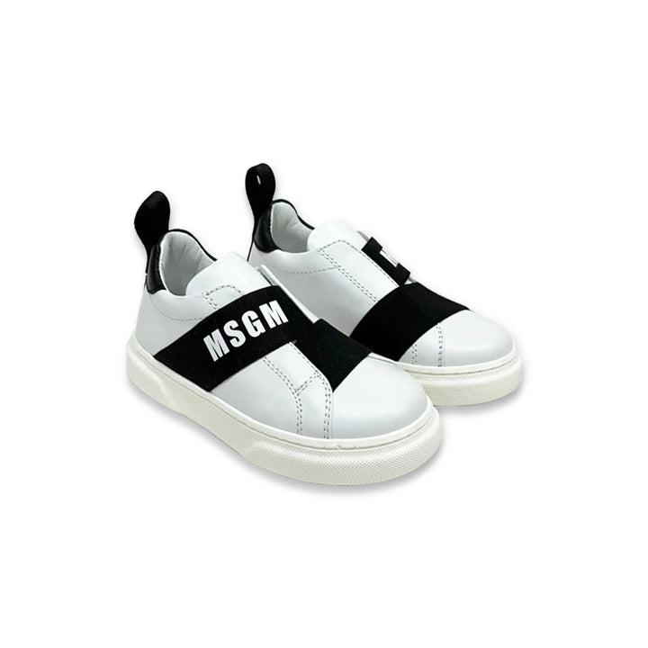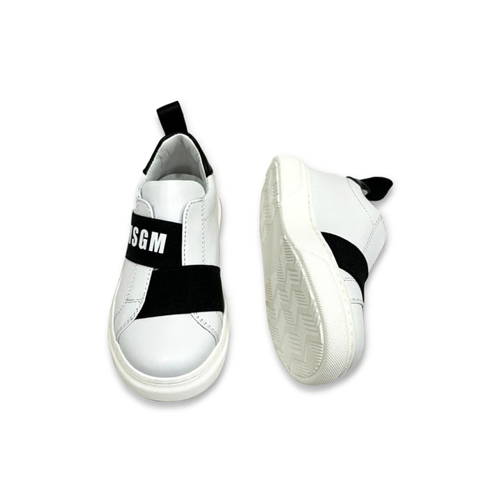 White leather trainers for boys and girls by MSGM. They are lined in soft leather, with a leather inner sole and non-slip rubber outer sole. Fastened with laces, they have a black logo print on the sides and the heel is trimmed in black.