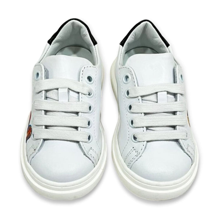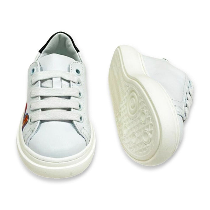 White leather trainers for boys and girls by MSGM. They are lined in soft leather, with a leather inner sole and non-slip rubber outer sole. Fastened with laces, they have a multi-color logo print on the sides and the heel is trimmed in black.