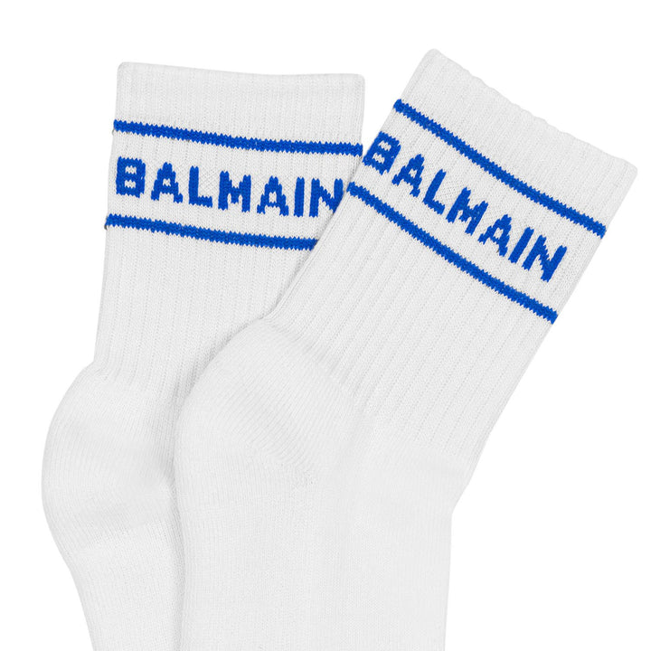 White socks from Balmain Kids. Made of cotton, this pair features a blue logo embroidery and ribbed cuffs.