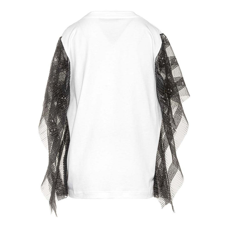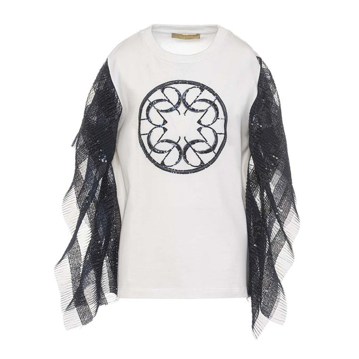 White Logo Sequin Embroidered Top with Black Frilled Sleeves