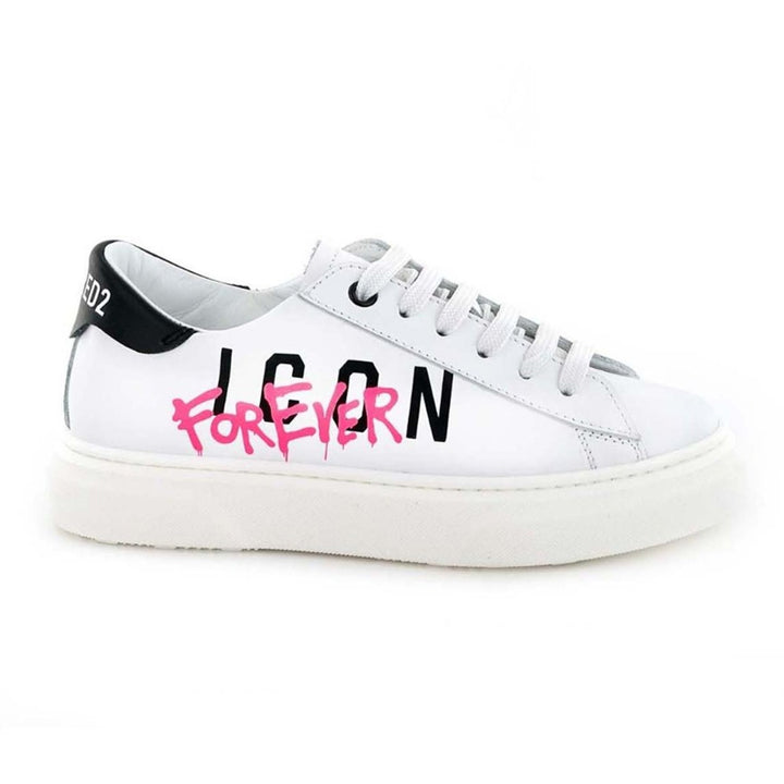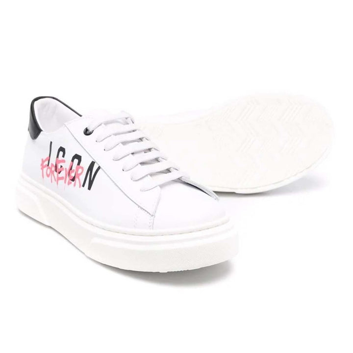 Crisp white low‑top sneakers featuring lace‑up fastening and a chunky white rubber sole for a clean, modern look. The side is detailed with bold “ICON Forever” graffiti‑style lettering in black and pink, while the contrasting black heel tab adds a subtle designer touch.