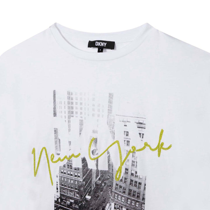 When you desire to dress your girl in a classic white t-shirt, we have this excellent option for you to choose from. It’s a white full sleeves T-Shirt with New York city landscape print on it with New York text printed over the city landscape graph