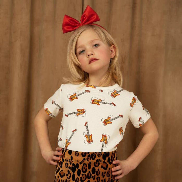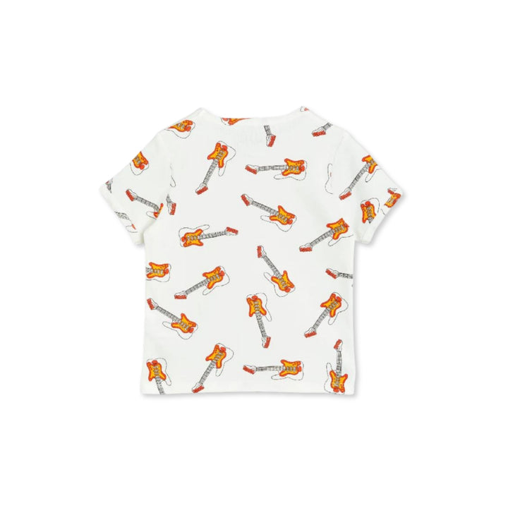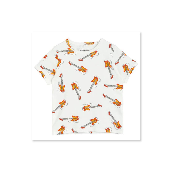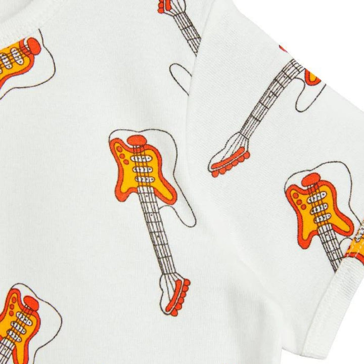A white half-sleeved organic cotton top for boys and girls by Mini Rodini, with a fun guitar print in red and yellow. Casual and comfortable it is made in soft jersey with a lightly ribbed crew neckline.