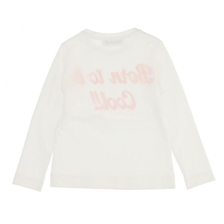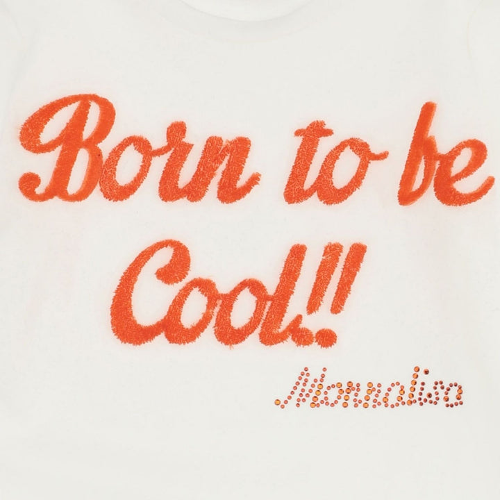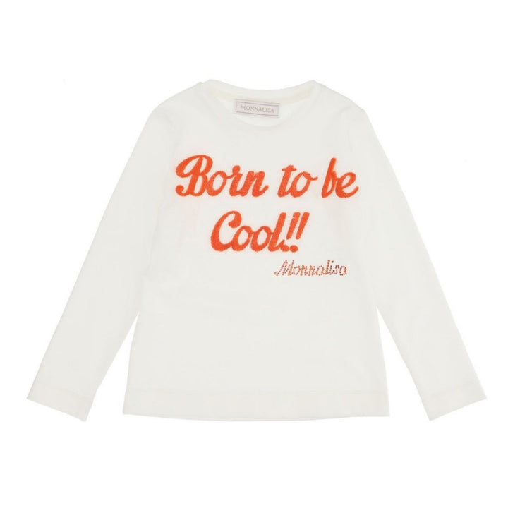 This white cotton T-shirt for girls is by Italian designer Monnalisa. It has a Orange Born to be Cool printed on the front, and the brand's logo. It is made in comfortable jersey and has Full sleeves.