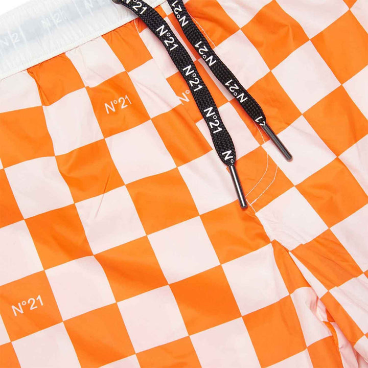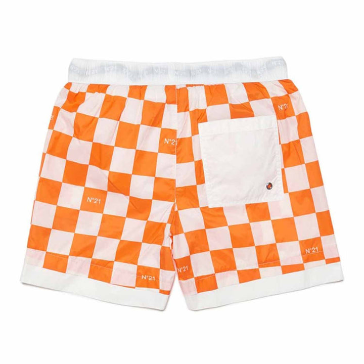 Lightweight nylon boxer swimming costume with damier graphic inspired by the Venice Beach Skatepark, contrasting colour logo, patch pocket in back.