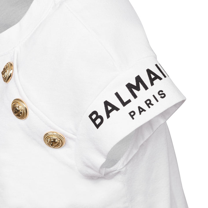 Bamain kids logo-print cotton T-shirt from Balmain Kids featuring white, cotton, logo print at the chest, embossed gold-tone buttons, button fastening at the shoulder, round neck, short sleeves and straight hem.