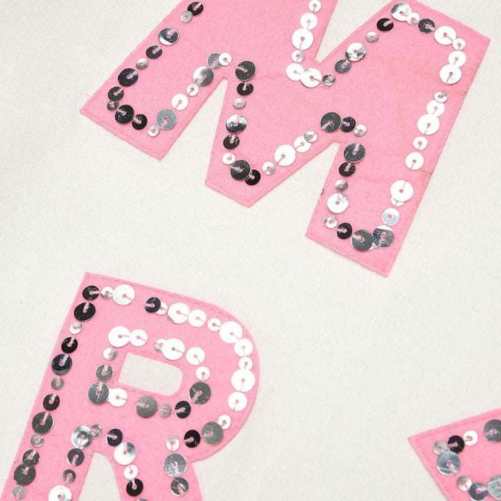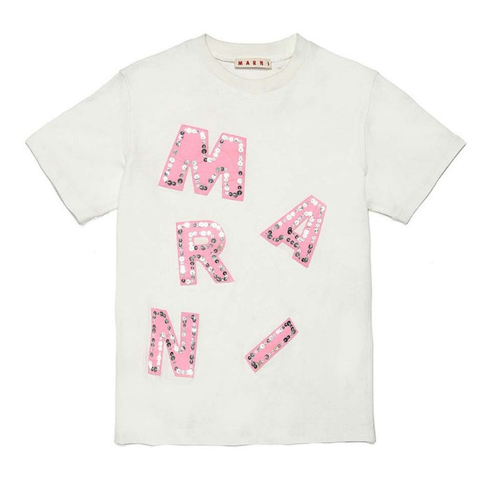 Short-sleeve, crew-neck white cotton jersey T-shirt with cloth patch application trimmed with sequins that form the MARNI logo.