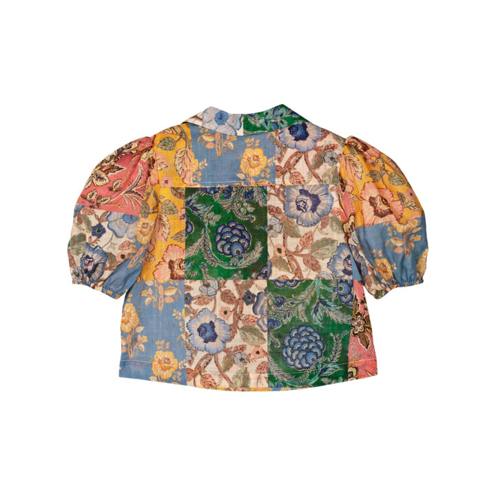 In complementary shades of blue, yellow and pink, this lovely shirt for girls is by luxury Australian designer Zimmermann. Made in lightweight and semi-sheer cotton, this resort-wear piece has an open collar and short sleeves with elasticated cuffs. The chest pocket is decorated with a delicate crochet trim and the wooden, flower-shaped buttons lend a boho touch. The contrasting florals and patchwork print add a vintage-style feel to this boxy top.