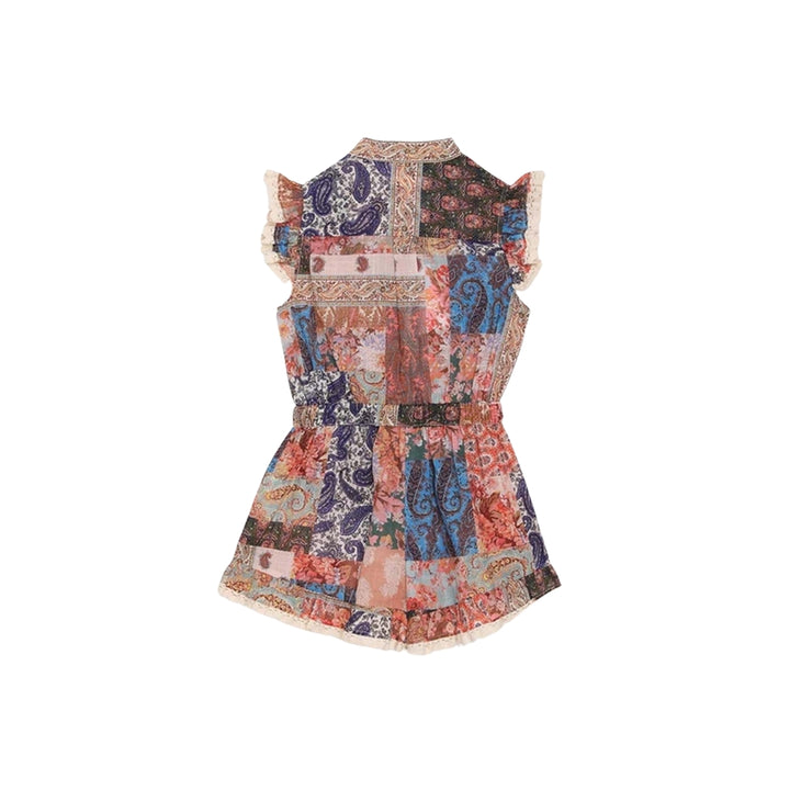The Devi Frill Jumpsuit in Patch Paisley from our Summer Swim 2023 Collection. A cotton playsuit featuring a drawstring waist, frilled sleeves and hems and scalloped edging throughout.\