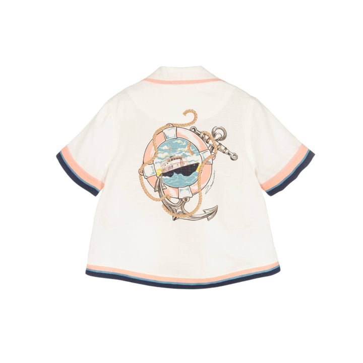 A casual ivory cotton shirt for girls by Australian brand, Zimmermann, with a nautical-themed motif on the back. Soft and lightweight, it has lovely pink and navy blue trims and a patch pocket on the chest. It is designed in a boxy fit with a revere collar and flower-shaped wooden button fastenings on the front.