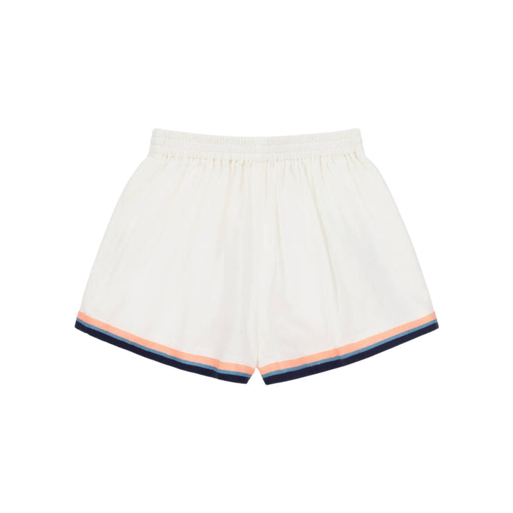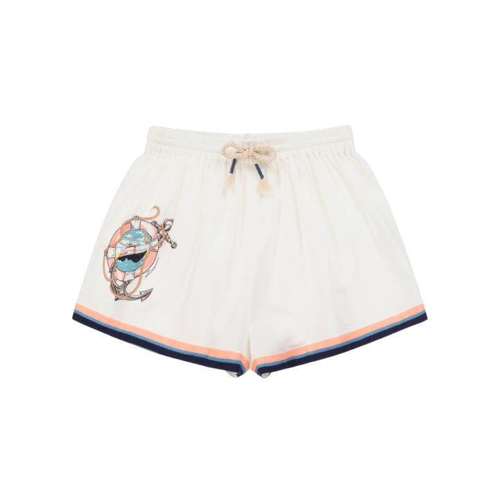 Lovely and casual ivory cotton shorts for girls by Australian brand, Zimmermann. There is a charming, nautical-themed print on the front and a pink flower motif on the back for an added feminine touch. Soft and lightweight, they are fully lined and gathered around the elasticated waist for a relaxed, flared shape with pink and navy blue stripes on the hem. The tasselled sailor rope drawstring can be adjusted for a good fit.