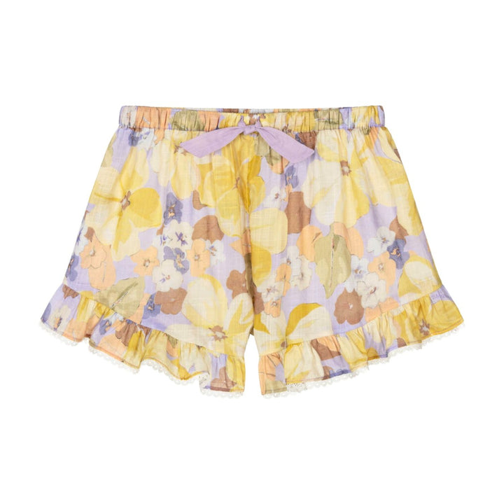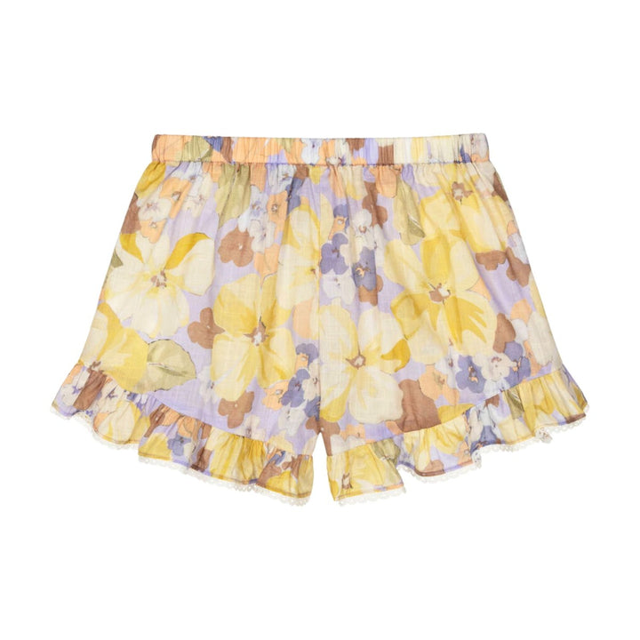 Lovely lilac purple shorts for girls by Australian brand Zimmermann, made in soft, semi-sheer cotton. Ideal for warmer days they are cool and lightweight and patterned with a colourful floral print in shades of yellow, purple and orange. There are ruffle trims on the legs, edged with pretty white loop lace and a comfortable elasticated waistband with a lilac purple bow trim on the front.
